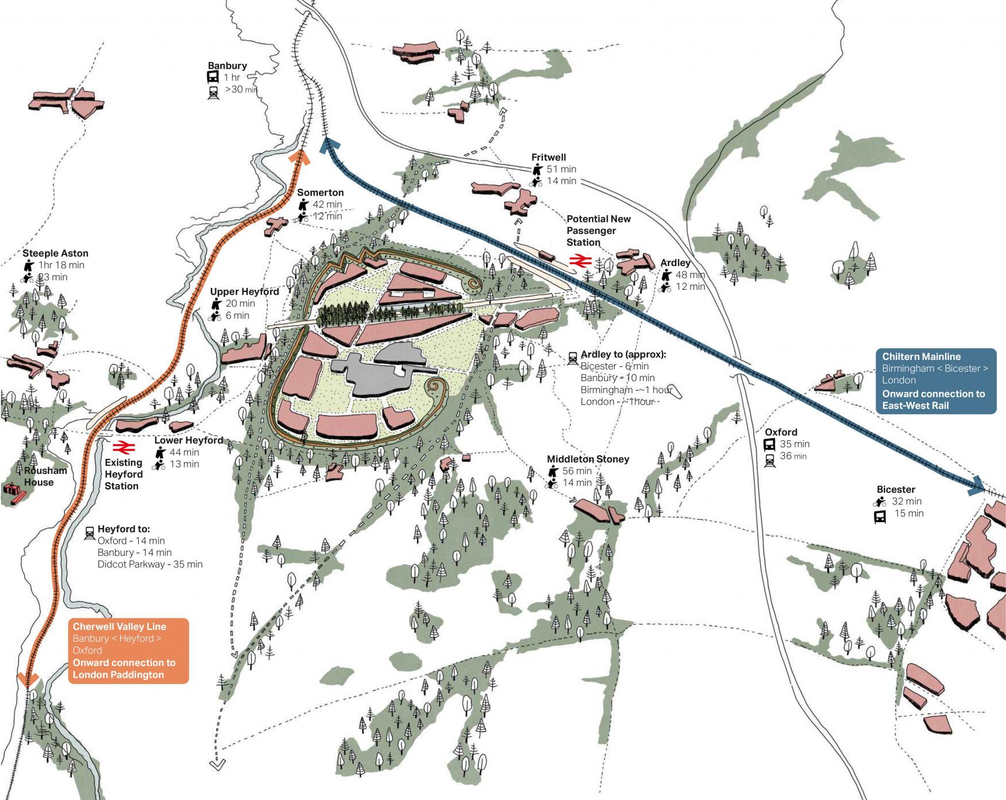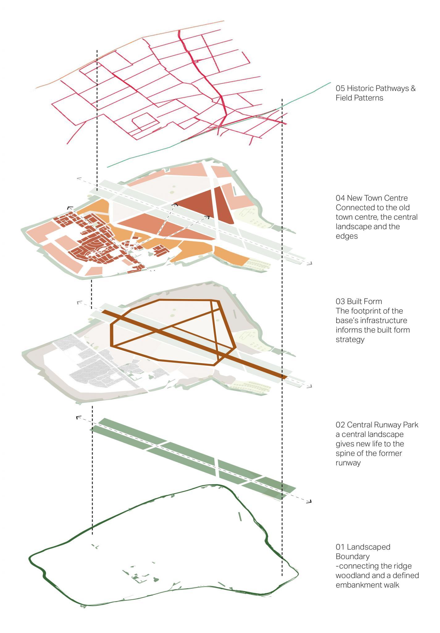 Central to the masterplan is the innovative reuse of the existing airfield infrastructure and historic structures. Former runways and taxiways will be transformed into movement corridors and public parks. This approach not only preserves the site's character but also creates a unique urban landscape that reflects its past. The design team examined the layered history of Heyford Park, drawing inspiration from ancient routes and integrating the Iron Age Aves Ditch and the Roman Port Way— ensuring the site's heritage is embedded in the masterplan.