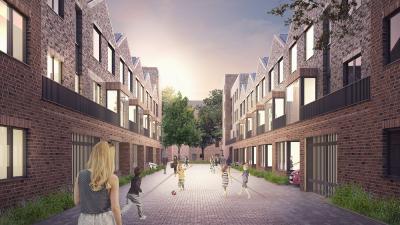 Rooted in an understanding of place and community, the masterplan is structured around three distinct character areas. A network of mews streets, domestic in scale and suburban in character, provides the majority of of family housing. Building heights rise towards the centrally located ‘green heart’—a revitalised public open space that retains many of the existing mature trees, ensuring continuity of landscape character while enhancing security, visibility, and everyday usability. Along the northern edge, a series of more robust, larger-scale buildings help define the new neighbourhood’s skyline and reinforce its urban edge.