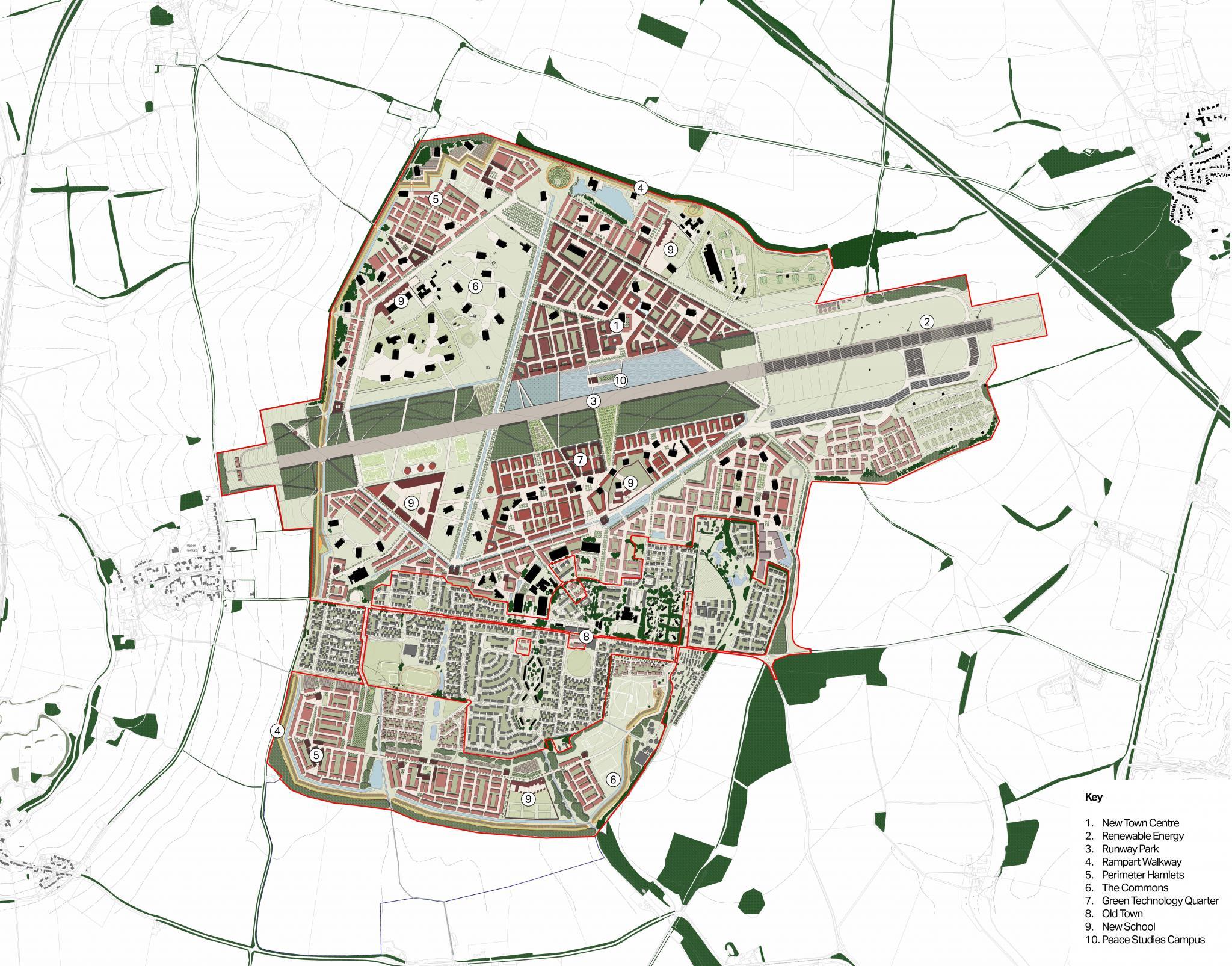 Central to the masterplan is the innovative reuse of the existing airfield infrastructure and historic structures. Former runways and taxiways will be transformed into movement corridors and public parks. This approach not only preserves the site's character but also creates a unique urban landscape that reflects its past. The design team examined the layered history of Heyford Park, drawing inspiration from ancient routes and integrating the Iron Age Aves Ditch and the Roman Port Way— ensuring the site's heritage is embedded in the masterplan.