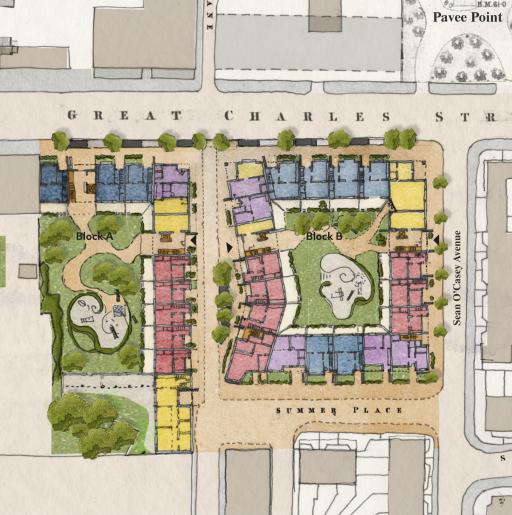 Building A, designed by Proctor & Matthews Architects, within the O’Donnell + Tuomey masterplan, is configured as an L-shape and provides 38 one-to-three-bedroom apartments and maisonettes (with 92 homes provided overall). To the north, both the massing and elevations reference the formal Georgian character of Great Charles Street, establishing a strong civic presence. Upper levels access galleries and threshold spaces to ground floor duplexes are screened behind a formal colonnade. This acts as a threshold device between the busy street and the residential accommodation within. Street level entrances are celebrated with pre-cast concrete portals (a reference to the celebrated Georgian architectural doorways), providing a clear demarcation between the private amenity spaces and street level dwelling frontages.