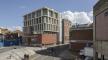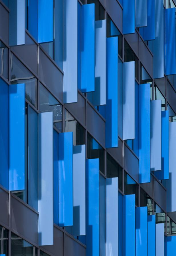 The colourful facade of the office building facing a central court contrasts strongly to the contextual response of the Havelock Road facade of Lacuna Place.
