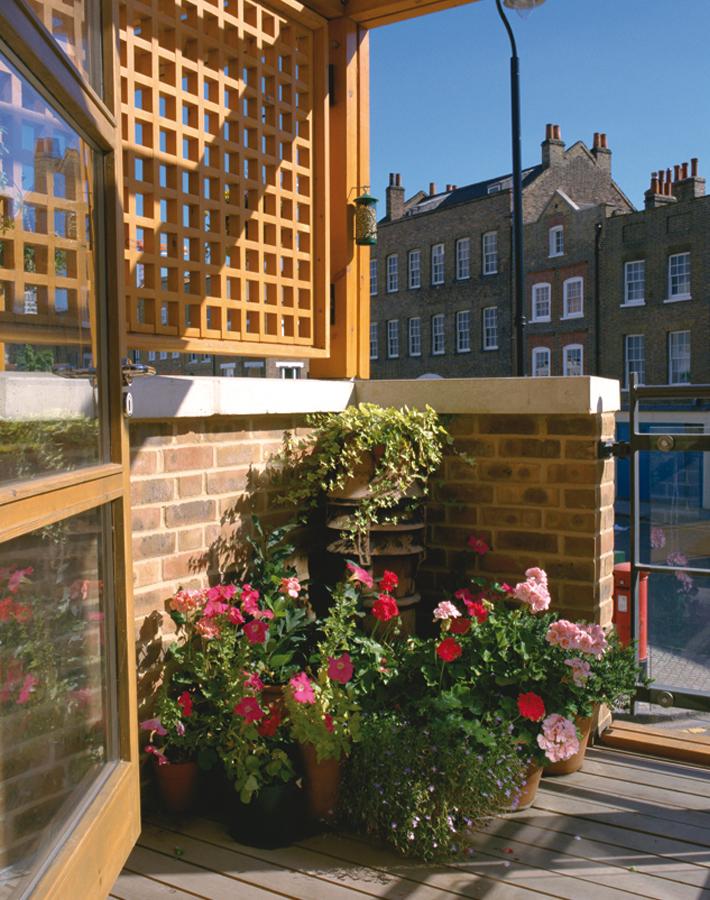 The composition of the building components of the Ropemakers Field facade respond to the configuration of the listed Georgian Terrace on Narrow Street opposite. In addition the materials base with simple brick walls are complemented with a filigree of stained timber entrance structures, rooftop pergolas and two-storey framed window panels.