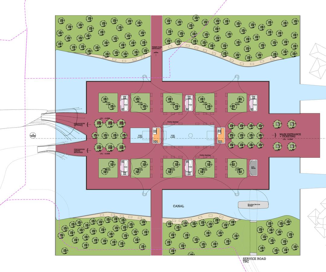 It is surrounded by a wide undulating canal system with bridge links to the other parts of the park, which also create dramatic thresholds, heightening the sense of anticipation among visitors as they pass from one distinctly different park experience to another.