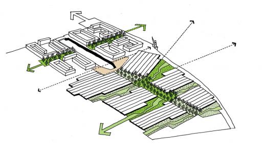 The looser semi-urban arrangement of housing towards the north is defined by three east-west landscaped ‘fingers’ that act to draw out and continue the existing landscape park situated adjacent to the site. This enables the proposed built form to visually connect with the distant forests that sit on the far bank of the River Medway. These green fingers are expressed as ‘free form’ landscapes incorporating swales, natural marshland vegetation, grasslands and wild flowers. Housing proposed for this area comprises low-rise two storey dwellings forming informal courtyard clusters.